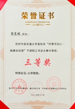近日,由遵义市文联、遵义市总工会、遵义市直机关工委主办,遵义市书法家协会承办的市直机关干部职工书法大赛评选揭晓,我校退休教师陈东林的书法作品《新城道中》荣获三等奖。